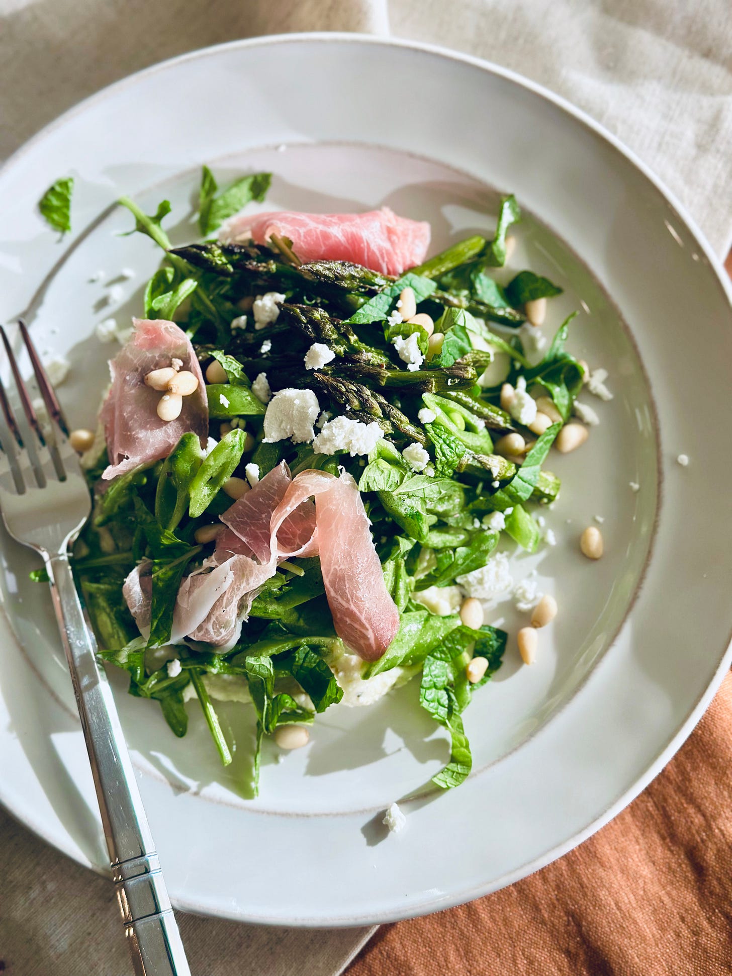 I love the collection of textures in this salad, crisp sugar snap peas, tender asparagus tips, ribbons of prosciutto, toasted pine nuts and fresh mint all nestled on a cloud of creamy lemon scented ricotta. Because who doesn’t like something creamy?! It’s fresh, elegant, and deceptively simple, perfect for when you want to serve something that feels special but still comes together with ease.